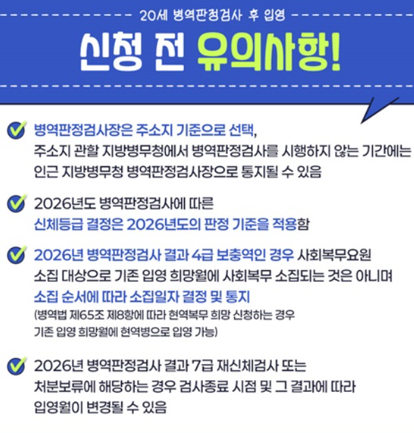 2026년에 병역판정검사를 받고, 현역병 입영 대상인 경우 2026년 희망월에 입영.