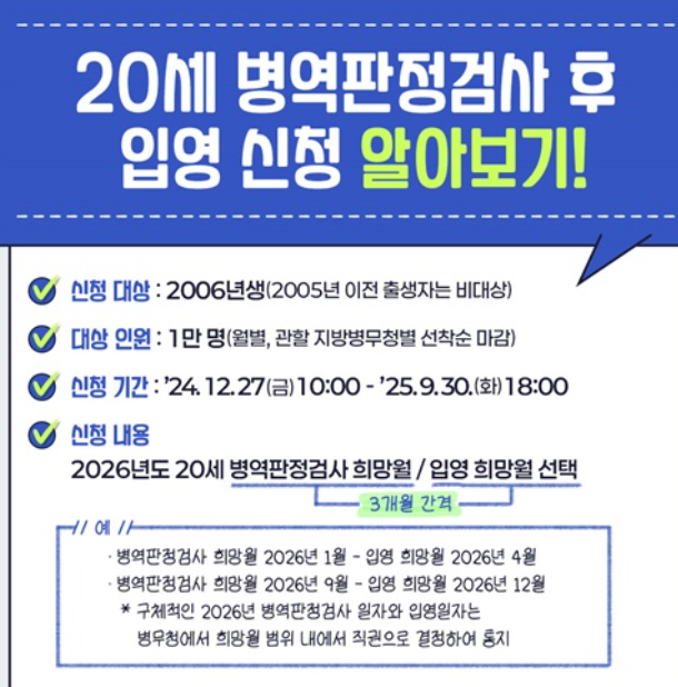 2025년에 병역판정검사를 받고, 이후 별도로 입영 신청.