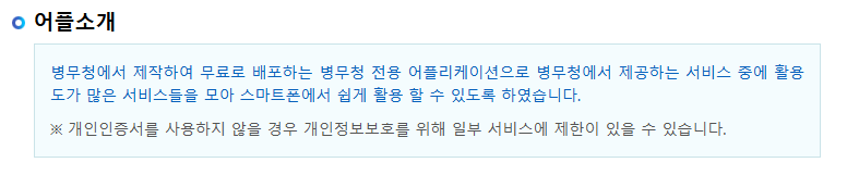 병무청에서 무료로 배포하는 벙역안내 전용 어플리케이션으로, 병무청에서 제공하는 서비스 중에 활용도가 많은 서비스들을 모아 스마트폰에서 쉽게 활용할 수 있도록 되어있습니다.