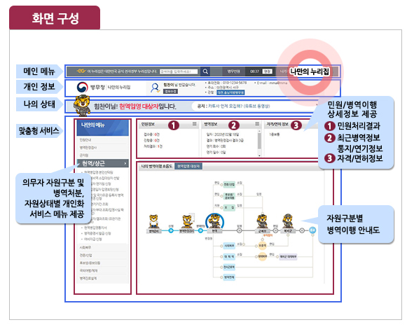 이곳에서는 병역 의무에 대한 안내, 신청서 작성, 그리고 개인 맞춤형 서비스인 '나만의 누리집'을 이용할 수 있습니다. 누구나 쉽게 필요한 정보를 찾을 수 있도록 돕고 있습니다.