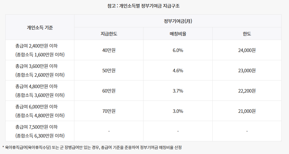 기여금은 가입자의 소득 구간과 납입 금액에 따라 차등 지급됩니다. 2025년부터는 모든 가입자가 납입한 금액의 최대 한도(70만 원)까지 매칭비율에 따라 기여금을 지원받을 수 있습니다.