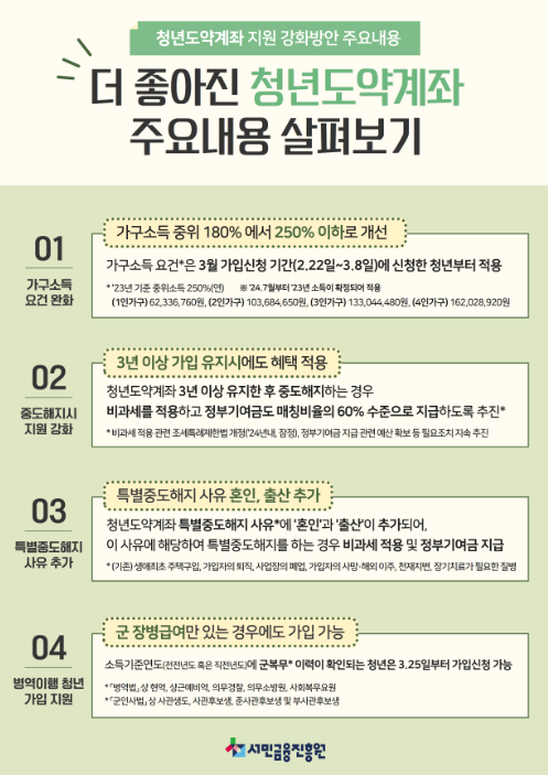 마지막으로, 가구원 수에 따른 기준 중위소득 250% 이하의 조건도 충족해야 합니다. 이러한 조건을 만족하는 청년들은 누구나 청년도약계좌에 가입할 수 있습니다.